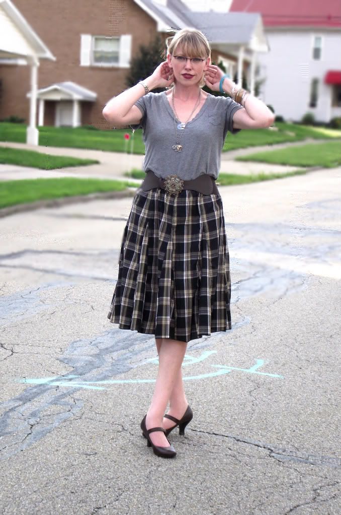 Skirt, Earrings and Gold Bangle:B.Moss/Tee and Beaded Bracelet:Target/Ring:LOFT/Silver Bangles:H&M/Blue RESPECT bracelet:Special Olympics/Shoes:TJ Maxx/Shine Necklace:The Shine Project/Elephant Necklace and Belt:Ruche